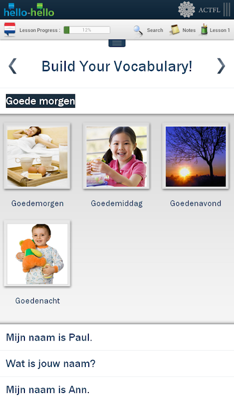 Hello-Hello Dutch is a full-fledged language course with 30 LESSONS developed in collaboration with the American Council on the Teaching of Foreign Languages (ACTFL), so you can be assured that these lessons follow an effective research-based methodology. All lessons are conversational based on realistic dialogues and situations, rather than a collection of out-of-context words and phrases.
