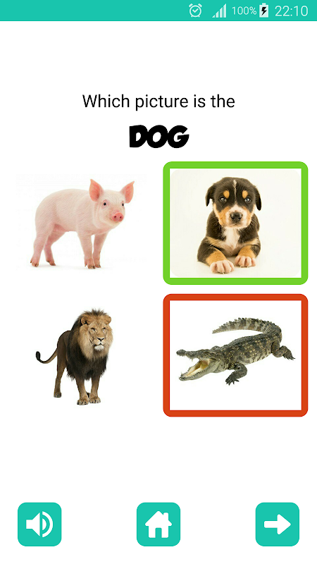 Game 2: One random English word from the selected category is displayed and you are asked to select the correct picture from the options.