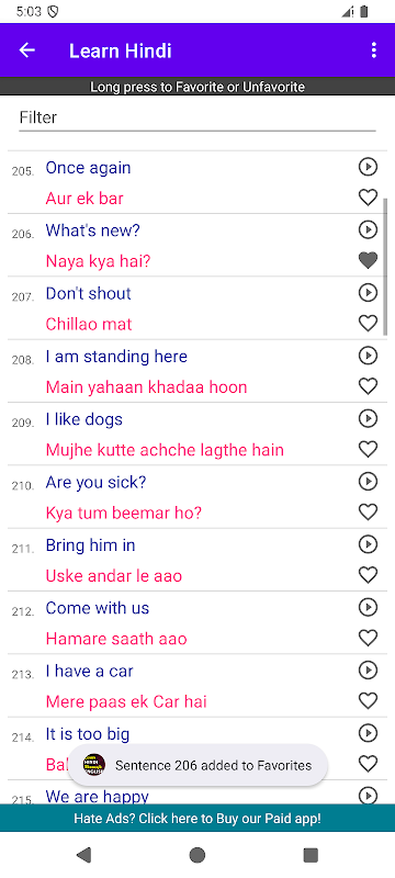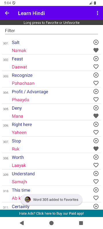 এই অ্যাপটি আপনাকে হিন্দি অক্ষর শেখার প্রয়োজন ছাড়াই সহজে ইংরেজির মাধ্যমে কথ্য হিন্দি শিখতে সাহায্য করে। স্পষ্ট অডিও উচ্চারণ সহ 850টি সাধারণভাবে ব্যবহৃত হিন্দি শব্দ এবং 550টি দৈনিক-ব্যবহৃত হিন্দি বাক্য সহ, আপনি ধাপে ধাপে আপনার হিন্দি বলার দক্ষতা তৈরি করতে পারেন। আপনার নিজের গতিতে অনুশীলন করুন এবং আত্মবিশ্বাসের সাথে হিন্দি বলা শুরু করুন।