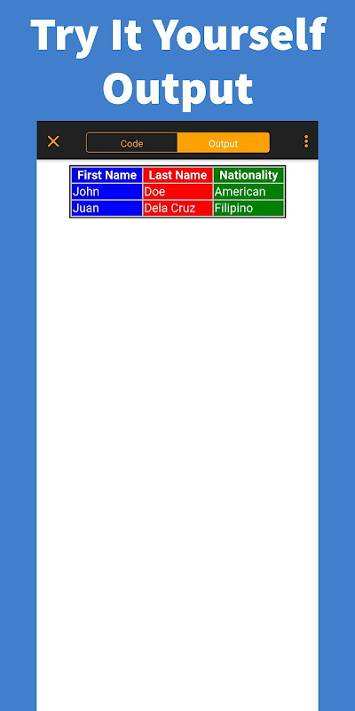 এটি নিজে চেষ্টা করে দেখুন এইচটিএমএল অফলাইন, কোড খেলার মাঠ / সম্পাদক এবং ক্যুইজ!