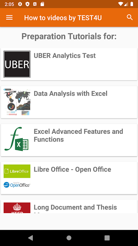 This app includes the whole TEST4U Collection of How-To Videos, categorized into distinct submenus.