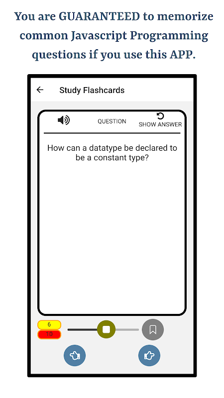 এই অ্যাপটি জাভাস্ক্রিপ্ট প্রোগ্রামিং ল্যাঙ্গুয়েজ সম্পর্কে জানার জন্য একটি দুর্দান্ত সম্পদ। অ্যাপটি খুব অল্প সময়ের জন্য অধ্যয়ন করে ব্যবহারকারীদের সাধারণ জাভাস্ক্রিপ্ট প্রোগ্রামিং ভাষার প্রশ্নগুলিকে নিখুঁত বোঝার জন্য তৈরি করা হয়েছে। অধ্যায়, বিভাগ, অধ্যয়ন মোড এবং কুইজ মোডগুলিতে অডিও কার্যকারিতা এবং বুকমার্কিং অ্যাপ জুড়ে উপলব্ধ।