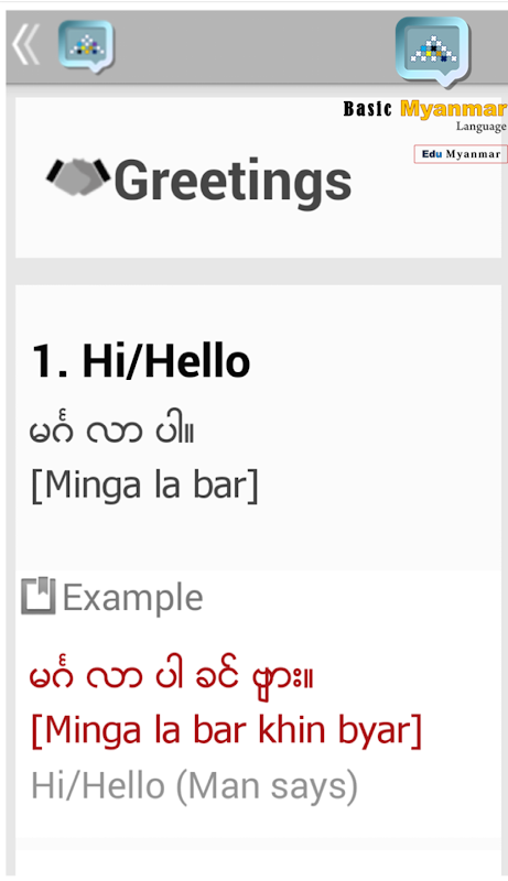 এই অ্যাপটি বিভিন্ন পরিস্থিতিতে শব্দভান্ডার ব্যবহার করে শুরু থেকে বার্মিজ ভাষা শিখতে চান এমন ব্যবহারকারীদের সাহায্য করার জন্য তৈরি করা হয়েছে।