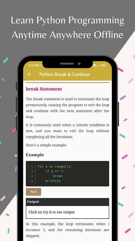 পরিষ্কার ব্যাখ্যা, ব্যবহারিক উদাহরণ এবং ইন্টারেক্টিভ ব্যায়াম সহ আমাদের ব্যবহারকারী-বান্ধব অ্যাপের মাধ্যমে পাইথন প্রোগ্রামিংয়ের জগতে ডুব দিন। আমরা সমস্ত স্তরের জন্য একটি মসৃণ শিক্ষার যাত্রা নিশ্চিত করে, মৌলিক মৌলিক বিষয়গুলি থেকে আরও উন্নত ধারণা পর্যন্ত সবকিছুই কভার করি।