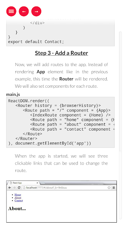 এই অ্যাপটিতে চমৎকার কোড উদাহরণ সহ React js-এর সমস্ত প্রধান বিষয় রয়েছে। সমস্ত বিষয়ে কোড উদাহরণ রয়েছে যাতে আপনি কী ঘটছে তা আরও ভালভাবে বুঝতে পারেন। এর সুন্দর ইউজার ইন্টারফেস এবং অনুসরণ করা সহজ গাইডের সাহায্যে আপনি কয়েক দিনের মধ্যে প্রতিক্রিয়া এবং ফ্লাক্স শিখতে পারেন এবং এটিই এই অ্যাপটিকে অন্যান্য অ্যাপ থেকে আলাদা করে তোলে। আমরা প্রতিটা নতুন বড় রিঅ্যাক্ট জেএস রিলিজের সাথে এই অ্যাপটিকে ক্রমাগত আপডেট করছি এবং আরও কোড স্নিপেট এবং উদাহরণ যোগ করছি।