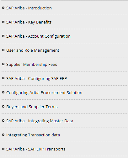 SAP Ariba, Tutorial, Introduction, Key Benefits, Account Configuration, User and Role Management, Supplier Membership Fees, Configuring SAP ERP, Configuring Ariba Procurement Solution, Buyers and Supplier Terms, Integrating Master Data, Integrating Transaction data, SAP ERP Transports, Downloading workbooks, Installation, Configuration, Security Details, Logging and Auditing, Comparison With Other Tools, Solution areas, Configurable workflows, Reporting options, Integration with S/4 HANA, Best Practices for integration.