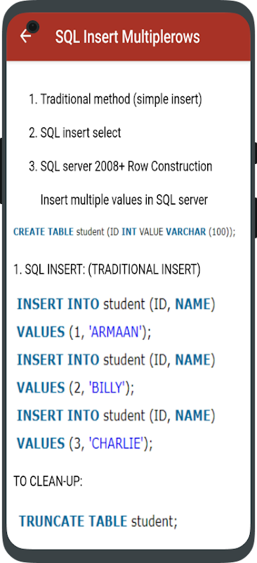 এই অ্যাপ্লিকেশনটি সমস্ত ডেটাবেস লার্নারদের আরও ভাল এসকিউএল প্রোগ্রামিং ধারণাটি শিখতে সহায়তা করে।
