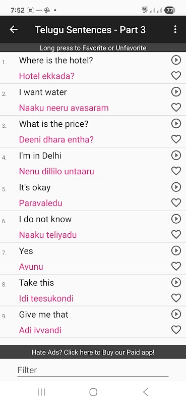 এটিতে 350টিরও বেশি সাধারণভাবে ব্যবহৃত তেলুগু বাক্য এবং 350+ প্রয়োজনীয় শব্দ রয়েছে, সবই স্পষ্ট অডিও উচ্চারণ সহ। আপনি ভ্রমণ করছেন, তেলেগু বন্ধুদের সাথে কথা বলছেন বা শুধু একটি নতুন ভাষা শিখতে চান, এই অ্যাপটি একটি নিখুঁত সূচনা পয়েন্ট।
