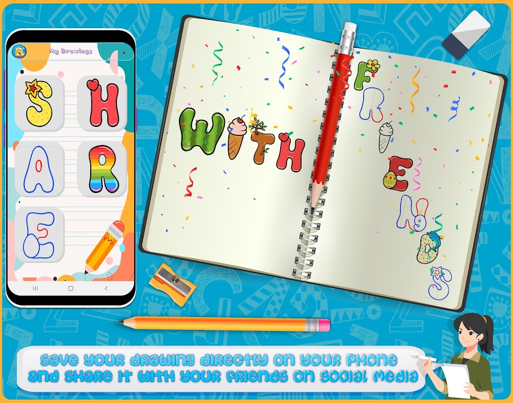 ABC কিভাবে আঁকতে হয় তা শিখুন একটি অফলাইন অ্যাপ যা রঙিন আড়ম্বরপূর্ণ বর্ণমালা ব্যবহার করে লিখতে চায় এমন সব বয়সের লোকেদের জন্য একটি অঙ্কন এবং রঙ পরিবেশন করে। অ্যাপ একটি রেডি টু ড্র সেটআপ সহ আসে। আপনি অ্যাপের ভিতরে থাকা টুলগুলি (পেন্সিল, ইরেজার, কালার প্যালেট ইত্যাদি) ব্যবহার করে সরাসরি আপনার ফোনের স্ক্রিনে সুন্দর বর্ণমালা অঙ্কন তৈরি করতে পারেন। ড্র কিউট এবিসি অ্যাপটি জুম-ইন বৈশিষ্ট্যও প্রদান করে যাতে আপনি প্রতিটি সামান্য বিবরণ দিয়ে একটি নিখুঁত স্কেচ তৈরি করতে পারেন। একটি পূর্বাবস্থা-পুনরায় করুন বৈশিষ্ট্যও রয়েছে যাতে আপনি যদি কোনও ভুল করেন তবে আপনাকে আবার শুরু করতে হবে না। শুধু পূর্বাবস্থায় থাকা বোতামে আলতো চাপুন এবং এটি শেষ আঁকা লাইনটি মুছে ফেলবে। আপনি আঁকা বর্ণমালা ব্যবহার করে দুর্দান্ত ড্যাশিং নাম লিখতে পারেন এবং আপনার ফোন থেকে সরাসরি সোশ্যাল মিডিয়া অ্যাপে আপনার বন্ধুদের সাথে শেয়ার করতে পারেন।