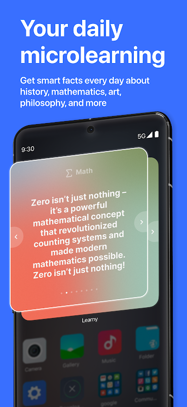 Learny এর সাথে, মাইক্রোলার্নিং যেকোন সময় অ্যাক্সেসযোগ্য। আমাদের প্রতিদিনের মাইক্রোলার্নিং ফিডে ডুব দিন, যেখানে প্রতিটি তথ্য আলোকিত ও অনুপ্রাণিত করার জন্য বেছে নেওয়া হয়। ফ্যাক্ট অফ দ্য ডে ফিচার নিশ্চিত করে যে আপনি প্রতিদিন সকালে নতুন উইজেট তথ্য দিয়ে শুরু করুন এবং সারা দিন আপনার কৌতূহলকে বাঁচিয়ে রাখুন।