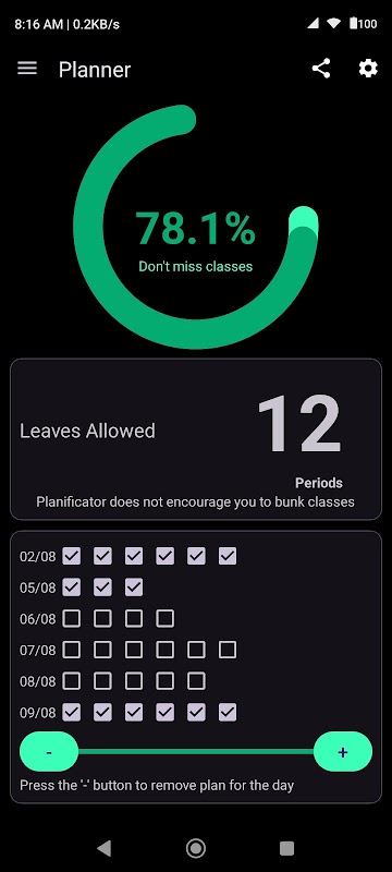 - দিনের জন্য আপনার উপস্থিতির পরিকল্পনা করুন (দিনের জন্য আপনার কতগুলি ক্লাস করতে হবে বা উপস্থিত থাকতে চান এবং দেখুন এটি আপনার সমস্ত উপস্থিতিতে কীভাবে প্রভাব ফেলবে)