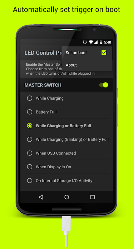 নির্দিষ্ট চার্জিং ট্রিগার উপর নির্ভর করে যখন প্লাগ এটি উজ্জ্বল করতে হবে, যা ডিভাইসের LED জন্য "ট্রিগার চার্জিং" নির্দিষ্ট কার্নেল নির্বাচন করার জন্য এই অ্যাপ্লিকেশন ব্যবহার করুন.