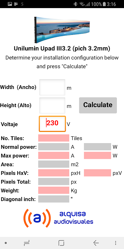 Consumption calculator, weights, pixels, tiles and area for led screens: