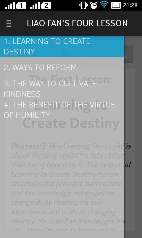 Liao ফ্যান এর চার পাঠ চার অধ্যায়ে ভাগ করা হয়েছে. একের পর এক অধ্যায় পড়া প্রতিটি দিন বিশ মিনিট সময় লাগে, এই বই চার দিনের মধ্যে সমাপ্ত করা সম্ভব হবে. একের পর এক বছরের জন্য ক্রমাগত এই বই সার্চ, তিনি মধ্যে গভীরভাবে অর্থ বুঝতে সক্ষম হবে. এই বইটিও ব্যাখ্যামূলক পাদটীকা এবং সহজ পড়ার জন্য সমসাময়িক চীনা সাহিত্য অনুবাদ সঙ্গে আসে.