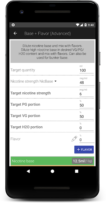 বেস + বেস + স্বাদ: বিভিন্ন ঘাঁটি এবং স্বাদে মিশ্রিত করুন। প্রয়োজনীয় নিকোটিন শক্তি এবং স্বাদ শতাংশ পেতে প্রতিটি উপাদান প্রয়োজনীয় পরিমাণ গণনা।