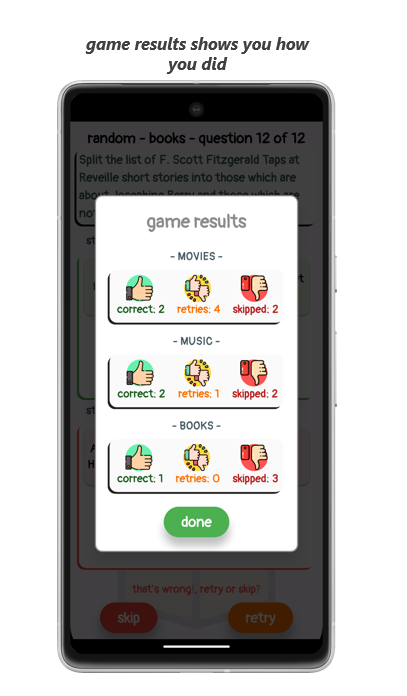 600টি প্রশ্ন সহ, এই অ্যাপটি তিনটি প্রধান বিভাগে আপনার সাধারণ জ্ঞান পরীক্ষা করবে; চলচ্চিত্র, সঙ্গীত এবং বই।