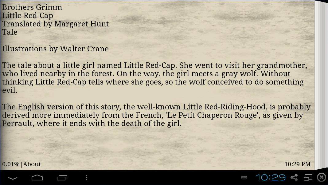 The English version of this story, the well-known Little Red-Riding-Hood, is probably derived more immediately from the French, 'Le Petit Chaperon Rouge', as given by Perrault, where it ends with the death of the girl.