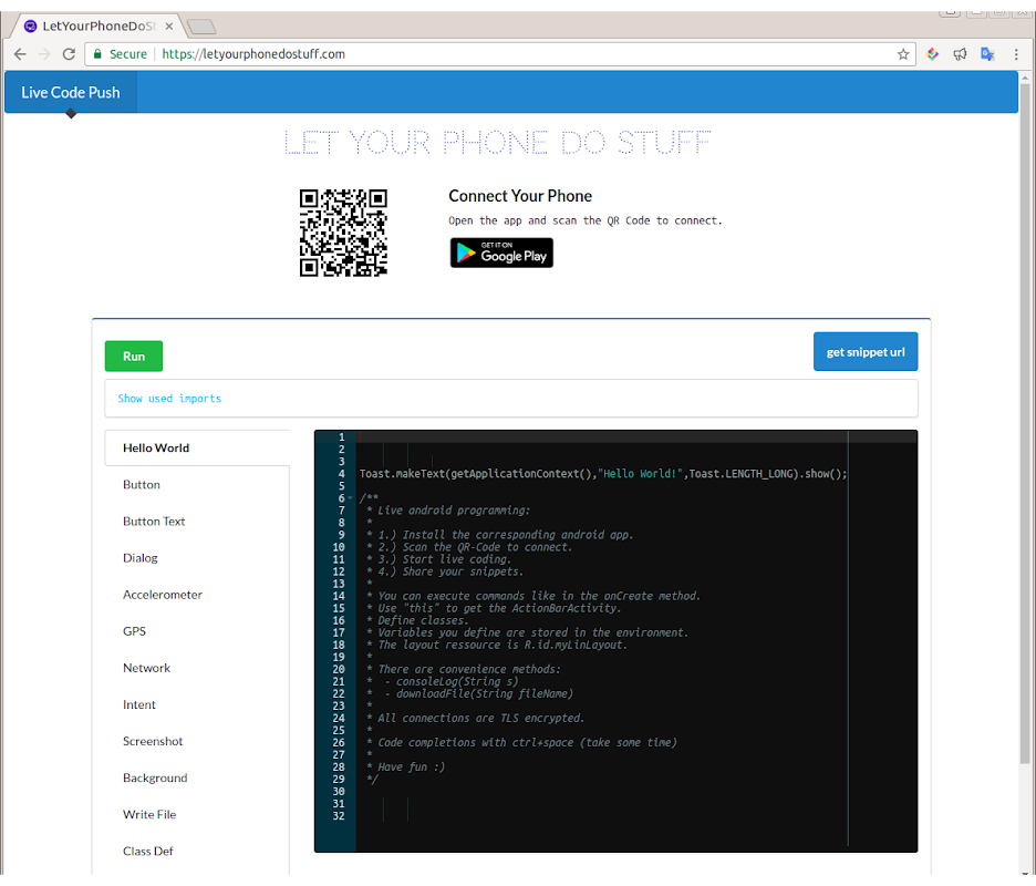 Online java programming for android, execute source code snippets which get compiled and dynamically loaded into the app at runtime. Useful as a development tool for rapid prototyping and to learn java android programming. You start with a blank page and create the app as you program.