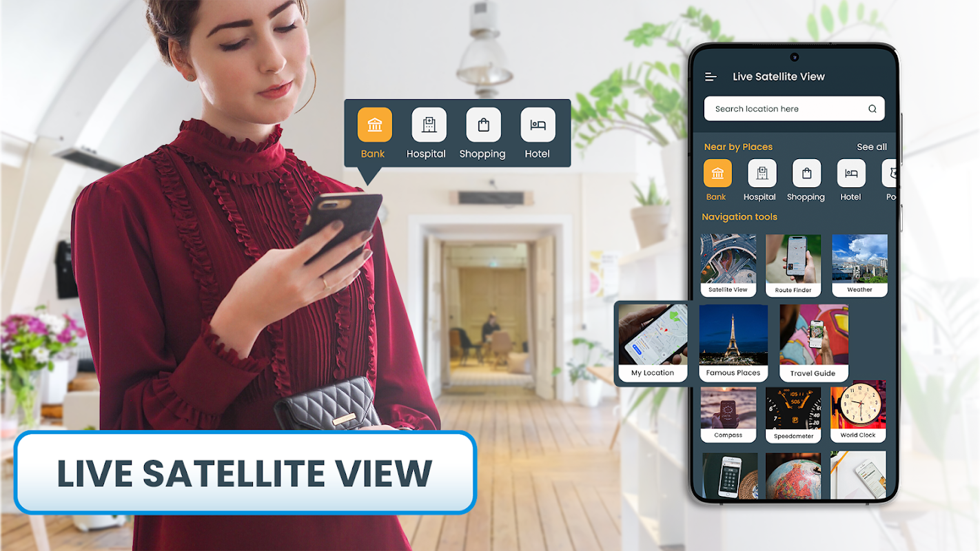 GPS Maps Live Satellite View will give you the best and shortest route to your destination, as well as the distance and time it will take you to get there. GPS Navigation route planner tell you where you are and what's nearby places to you, also you can get live traffic alert. Discover new places & travel with our Live GPS Navigation World Map.