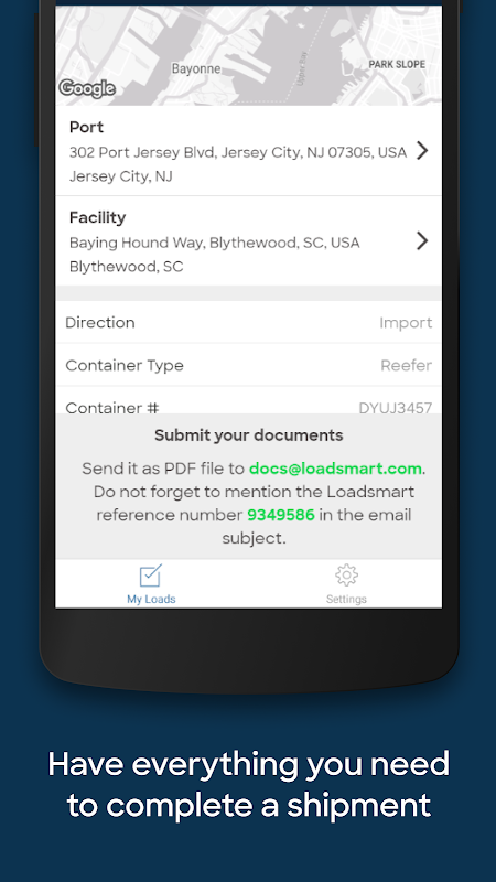 Loadsmart's Drayage app enables truckers to manage drayage shipments from Loadsmart. Use the app to receive all the information you need to pick up a container from a port terminal, deliver it to a customer warehouse and provide location and other updates during the journey. Get paid promptly when a shipment is completed.