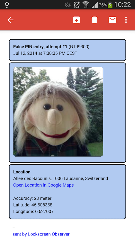 আপনি চিন্তিত হয়ে অন্য কেউ আপনার knowlegde ছাড়া আপনার ফোন অ্যাক্সেস পারে পেরেছেন? আপনি যখন করেছি মাত্র সংক্ষেপে, কক্ষ ত্যাগ যখন আপনি ঘুমিয়ে থাকেন বা আপনার ফোনটি হারিয়ে গেলেও? এটি নিরাপদ খেলুন এবং এটি খুঁজে বের করতে! যখনই কোন ভুল পিন কোড লেখা হয়েছে হচ্ছে lockscreen অবজারভার আপনার সামনের ক্যামেরা দিয়ে একটি ছবি লাগে। ফটো এবং ইমেইলের মাধ্যমে আপনার ডিভাইসের বর্তমান অবস্থান গ্রহণ করুন।