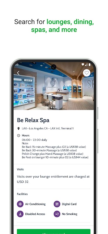বিশ্বব্যাপী 700 টিরও বেশি বিমানবন্দরে ডাইনিং, স্পা এবং ঘুমের পড সহ বিমানবন্দরের লাউঞ্জ এবং অভিজ্ঞতার একটি গ্লোবাল নেটওয়ার্ক অ্যাক্সেস করতে আপনার পেমেন্ট কার্ডের বিবরণ সহ অ্যাপে আপনার অ্যাকাউন্ট নিবন্ধন করুন।