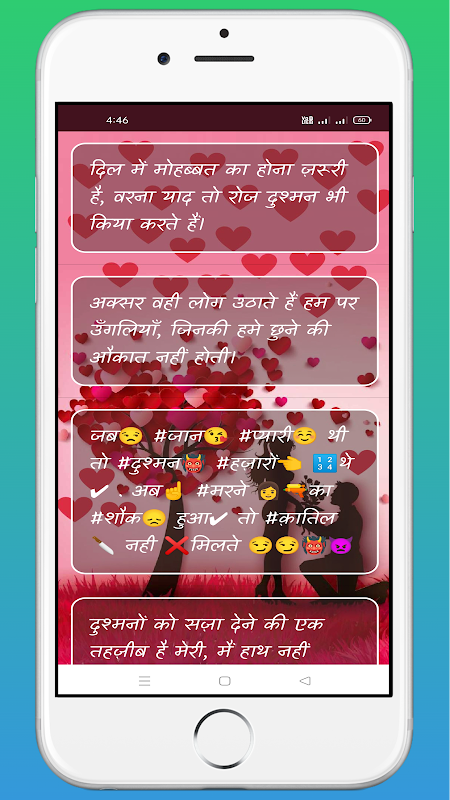 This app contains following category like best wishes Shayari, Good Morning shayari, Love Shayari, Friend Shayari, Attitude Shayari, Emoji Shayari, Funny Shayari, Birthday Shayari, Romantic Shayari, Life Shayari, Sad Shayari, Happy Shayari, Dard Shayari, Intezar Shayari, Bewafa Shayari, Navratri Shayari, New Year Shayari, Chrismas Shayari, Republicday Shayari, Valentine Shayari, Diwali Shayari, etc.