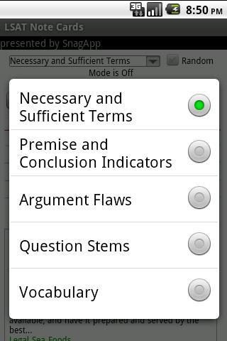 This LSAT flash card app has five sets of flash cards and hundreds of cards. The sets are necessary and sufficient terms, premise and conclusion indicators, argument flaws, question stems, and general vocabulary.