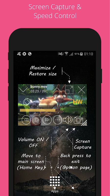 • এবি রিপিট মোড এবং উইন্ডো সাইজ অনুযায়ী অটো-রিসাইজ সাবটাইটেল সাপোর্ট করছে। আপনি ইশারায় উজ্জ্বলতা এবং ভলিউম এমনকি বর্তমান ভিডিও পজিশন নিয়ন্ত্রণ করতে পারেন