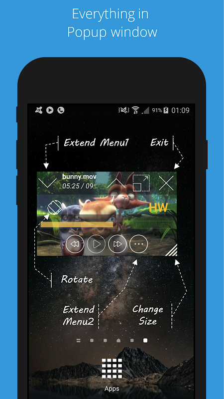 External পপআপ উইন্ডো মোড দিয়ে বাহ্যিক ফাইল ম্যানেজার থেকে শুরু করতে পারেন, যা ভিডিও প্লেয়ার অ্যাপগুলির মধ্যে সবচেয়ে উপকারী বৈশিষ্ট্য।