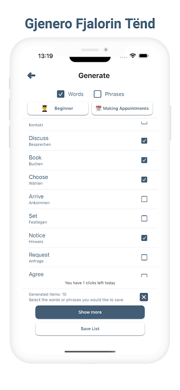 Sfidoni veten me teste të ndryshme si përputhja e fjalëve, përkthimi, të kuptuarit e dëgjimit dhe shqiptimi. Këto kuize ju ndihmojnë të gjurmoni përparimin Dhe të forconi njohuritë tuaja.