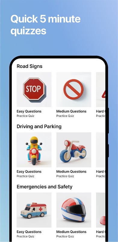 অফিসিয়াল হ্যান্ডবুকের প্রতিটি বিভাগ ফোকাসড কুইজে বিভক্ত। রাস্তার নিয়ম, ট্রাফিক লক্ষণ, রাইডিং কৌশল এবং নিরাপত্তার মতো মূল বিষয়গুলি অধ্যয়ন করুন।