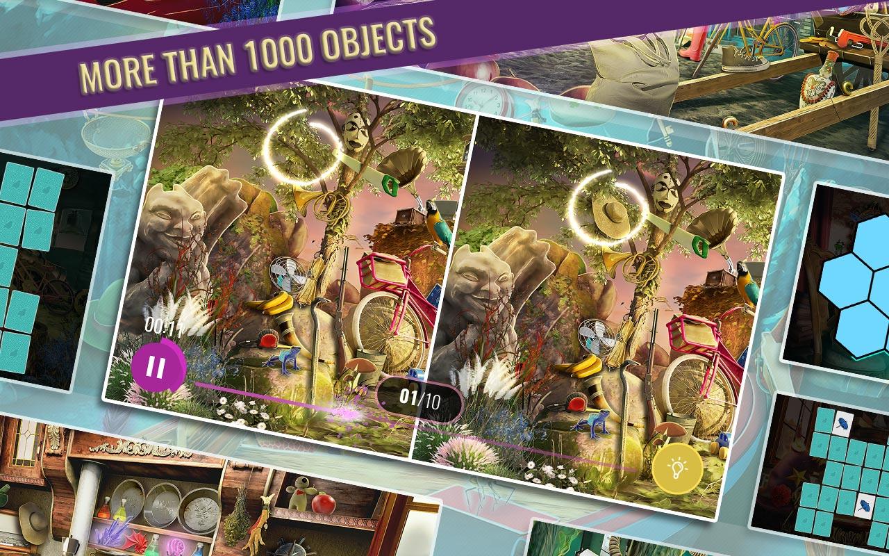 ✨ Follow the instructions and start a new mission! Find hidden objects in the picture that are written on the cards below. Click on the “light bulb” when you get stuck to use help. Find hidden figures according to their picture, silhouette, or decipher anagrams. Use a flashlight to find hidden objects in the dark. Solve fun puzzles that will entertain you for hours like find the difference, memory games with cards, and many others.