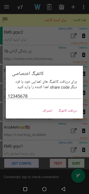 MahsaNG তৃতীয় পক্ষের VPN কনফিগারেশনের সাথে একযোগে কাজ করে যা "মাহসা সার্ভার" এর মাধ্যমে উদারভাবে আমাদের অবদান রাখে। এই কনফিগারেশনগুলি তারপর আমাদের ব্যবহারকারীদের মধ্যে বুদ্ধিমানের সাথে বিতরণ করা হয়।