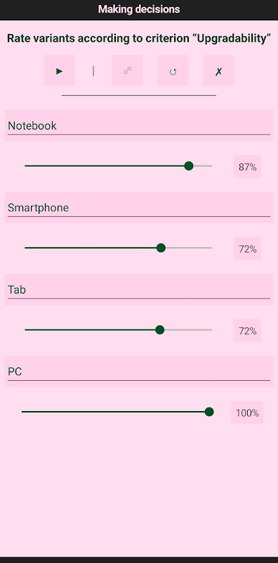 এই অ্যাপটি একটি গণিত পদ্ধতির চিত্র তুলে ধরে যা কিছু বস্তু বা ঘটনাকে মানদণ্ডের সেটের ভিত্তিতে তুলনা করতে এবং সবচেয়ে "সঠিক" একটি বেছে নেওয়ার অনুমতি দেয়। ব্যবহারকারীকে তাদের তুলনার জন্য স্বতন্ত্রভাবে বৈকল্পিক এবং মানদণ্ড নির্বাচন করার পাশাপাশি প্রতিটি মানদণ্ড এবং প্রতিটি উপাদানের তাৎপর্য নির্দিষ্ট করার জন্য আমন্ত্রণ জানানো হয়। ফলস্বরূপ, আপনি পরবর্তী প্রশ্নের উত্তর পাবেন: "কোন উপায়টি সর্বোত্তম"।