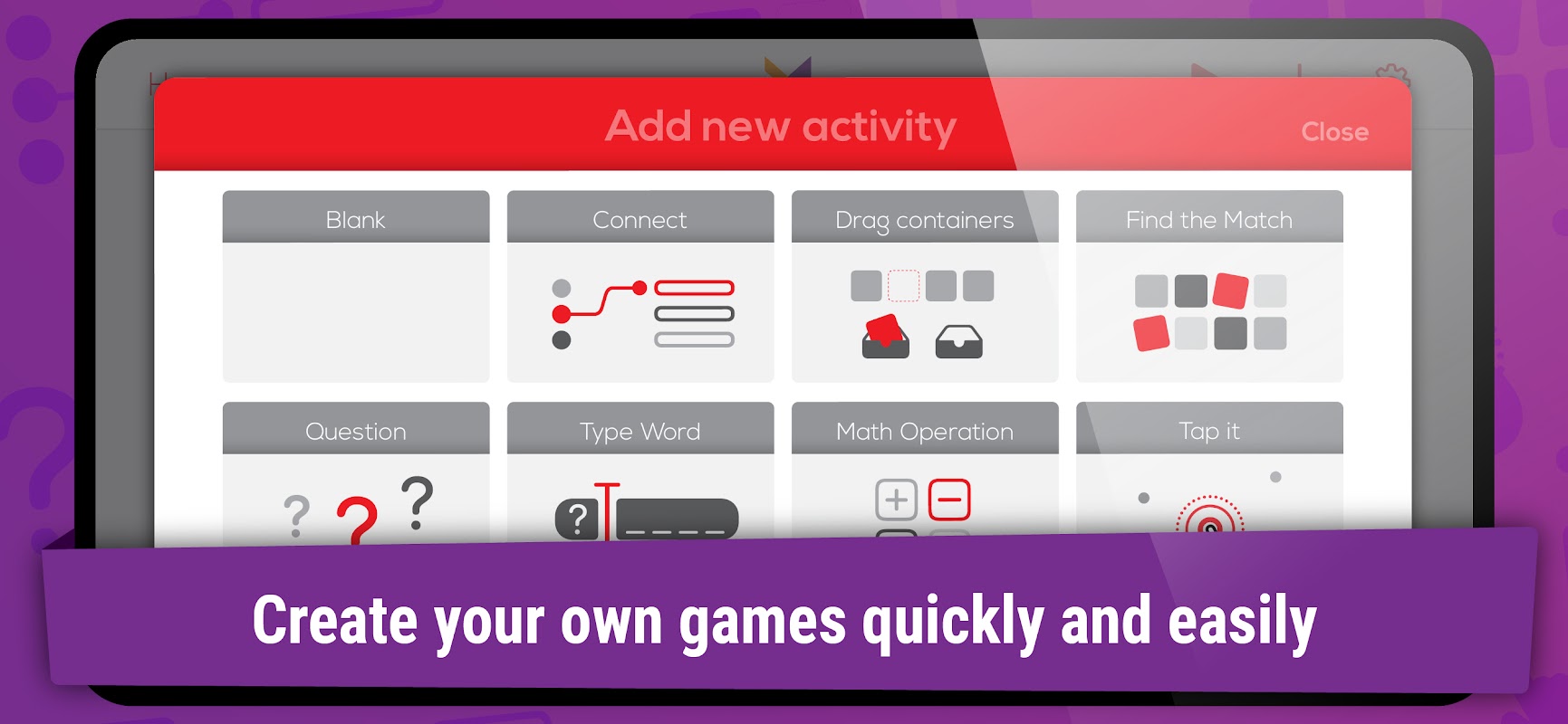 টেমপ্লেট এবং পূর্বনির্ধারিত গেমগুলির বিস্তৃত ভাণ্ডার সহ সহজেই এবং দ্রুত শিক্ষামূলক গেমগুলি তৈরি করুন।
