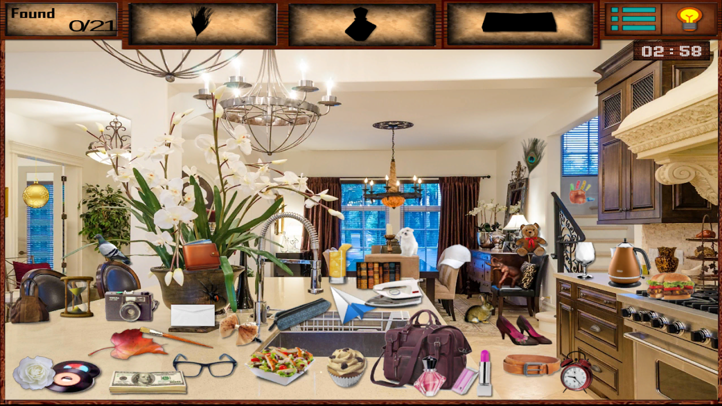 - Search for hidden objects, every time you play the same level, you get new missing items.