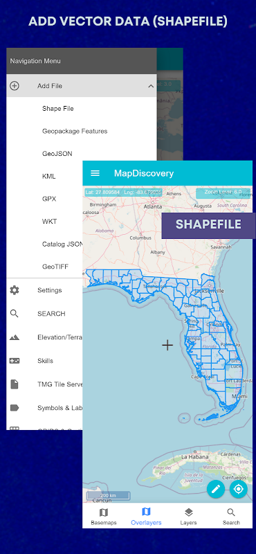 ব্যবহারকারীরা GIS ম্যাপিং ডেটা লোড করতে সক্ষম: mbtiles, gpkg, Shapefiles (zipped), KML, GPX, CSV, GeoJSON