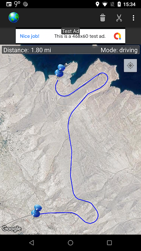 Create the path by tapping the map. Different modes of path creating are available: direct, driving, walking and bicycling. Direct mode draws straight lines between points. Driving, walking and bicycling modes are able to find and follow roads between points. Driving mode finds routes using the roads network. Walking mode uses pedestrian paths and sidewalks (where available). Bicycle mode uses bicycle tracks and preferred streets (this is currently available only in US). Distance between first and last point is shown on the top of the screen.