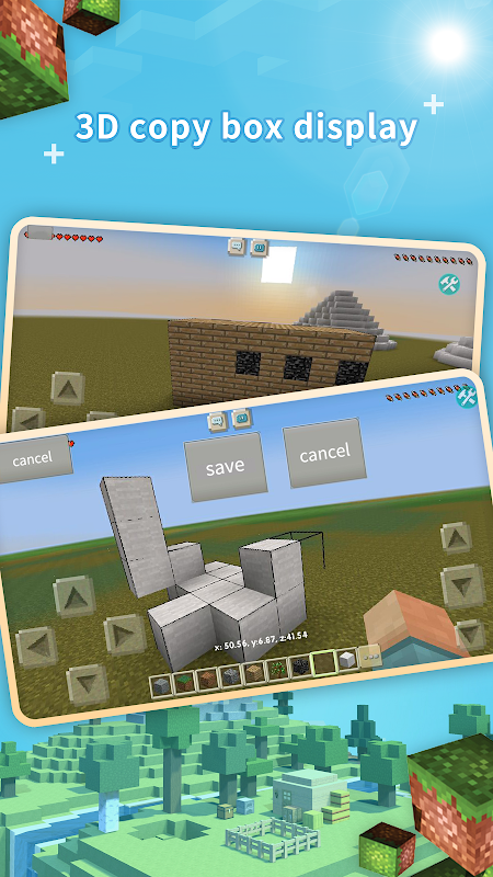 【Edit settings】 Time, weather, moving speed, put the block under foot, display coordinates, automatic walking, go through the wall and other features that allows you to edit the map more freedom., a variety of functions will save lots of construction time.