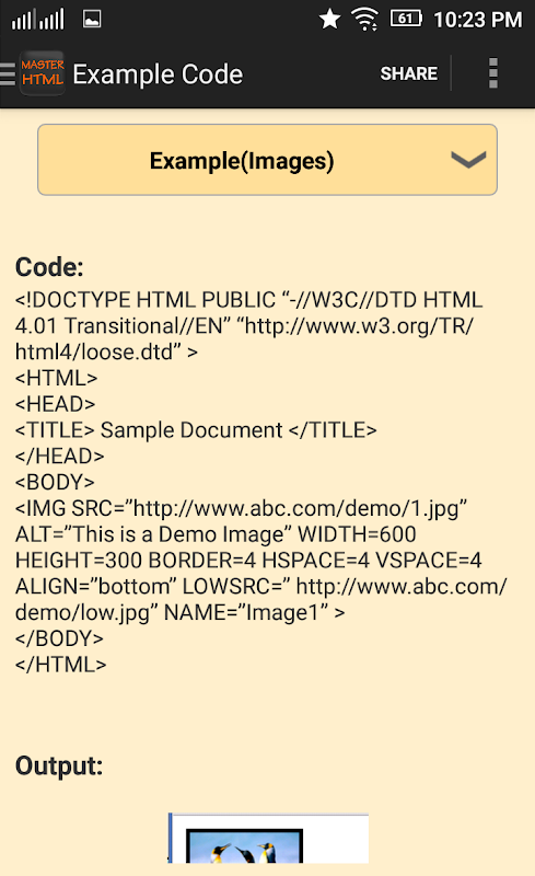 একটি লাইটওয়েট টুল, একটি দ্রুত রেফারেন্স নমুনা কোড এবং আউটপুট সঙ্গে এইচটিএমএল শিখতে.