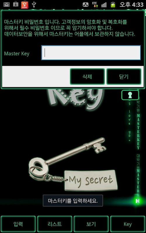 MasterKey is a notepad application that stores your notes in a secure manner using 128 bit encryption and provides quick & easy access using only one key password(master key value).