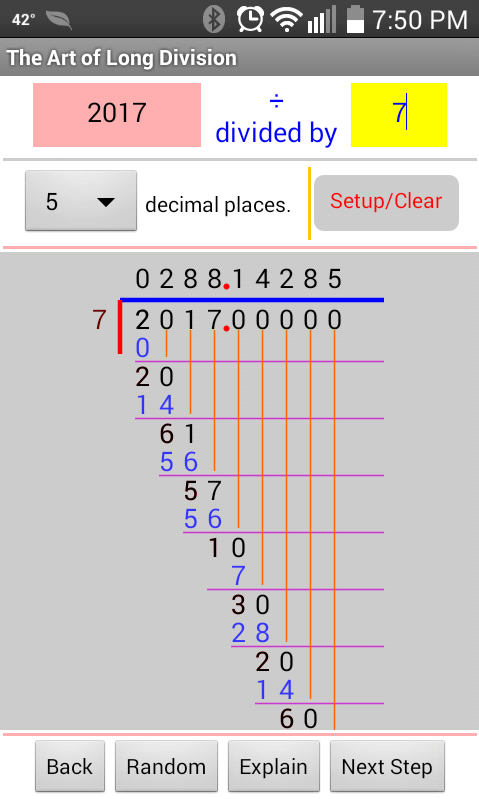 Long division is among the most notorious topics in school mathematics. However, it is also one of the most fruitful topics that allow children to have fun with mathematical thinking, if it is explored in a meaningful way. It combines addition, subtraction, multiplication, and, of course, division in a network of number senses. The key is balancing the procedures and the concepts behind the long process and allowing children to talk about the ideas and the patterns. Once children learned to enjoy the art and joy of long division, they may have a better experience with the mathematics that follow. And, yes, they should be allowed to use calculators for quick solutions later on. This app was inspired by two seven-year-olds I worked with about long division in late 2016. They enjoyed the art of long division and kept asking for more problems and sharing the patterns they discovered. Importantly, long division should not be forced on school children; but it can be a pleasurable experience for them to play with mathematics. There are, of course, other variations of the long division format.