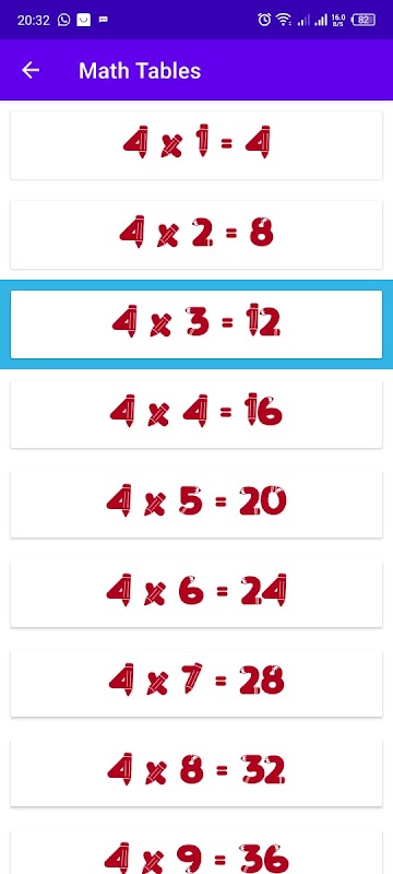 1. 20 গুণের সারণী: অ্যাপটিতে 20টি গুণের সারণী রয়েছে, যা 1 থেকে 20 পর্যন্ত সমগ্র পরিসরকে কভার করে, ব্যবহারকারীদের একটি ব্যাপক শিক্ষার অভিজ্ঞতা প্রদান করে।