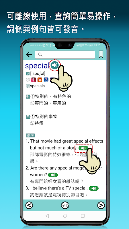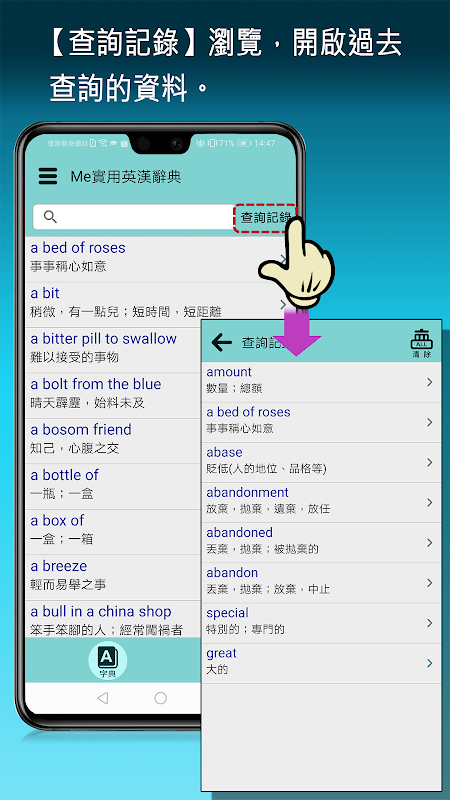 "মি প্র্যাকটিকাল ইংলিশ-চাইনিজ ডিকশনারি" ফোনেটিক প্রতীক, বাকের অংশ, শব্দের অর্থ এবং উচ্চারণের কার্যকারিতা সরবরাহ করে It এটি সাধারণ ক্রিয়াগুলির ক্রমবর্ধমান পরিবর্তন, বিশেষ্যগুলির বহুবচনীয় পরিবর্তন, বিশেষণ / অ্যাডওয়্যারগুলির তুলনামূলক এবং চূড়ান্ত পরিবর্তনগুলি সরবরাহ করে যাতে আপনি একক অক্ষরগুলির সঠিক ব্যবহার এবং উচ্চারণের অনুশীলন কেবল শিখবেন না। আপনি শিখেছেন এমন ভোকাবুলারি বা ভবিষ্যত পর্যালোচনার সুবিধার্থে আপনার বুকমার্কগুলিকে কঠিন বলে মনে করেন এমন ভোকাবুলারিও যুক্ত করতে পারেন।