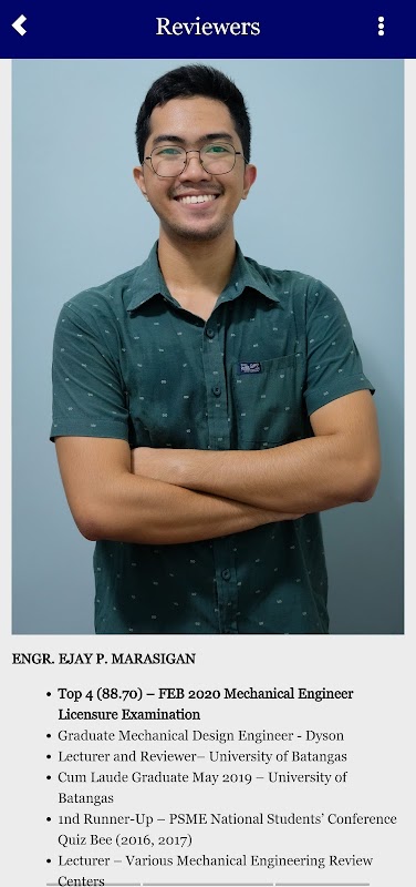 It is a comprehensive reviewer mobile app covering all the topics and details in the Mechanical Engineering syllabus and TOS. It includes lecture notes intended to orient the user on the basic concepts of each topic. The app offers video lectures to augment the lecture notes to discuss the subject's more complex and complicated topics. Sample problems are presented during the lessons to teach the user the concepts and theories. The user can access the app and learn their pacing in a stress-free environment.