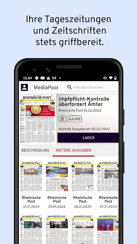 পড়ুন - যেখানে এবং যখন আপনি চান. আমাদের ডিজিটাল রিডার মিডিয়াপুলের সাথে আপনার কাছে সবসময় আপনার দৈনিক সংবাদপত্র এবং ম্যাগাজিন থাকে। আপনার ডিভাইস থেকে শুধুমাত্র একটি লগইন করে, আপনি সর্বদা আপনার ডিজিটাল সাবস্ক্রিপশনগুলি ঠিক যেখানে আপনার প্রয়োজন সেখানে পড়তে পারেন৷ মিডিয়াপুল হল আমাদের বিনামূল্যের পরিষেবার টুল শুধুমাত্র ims গ্রাহকদের জন্য।