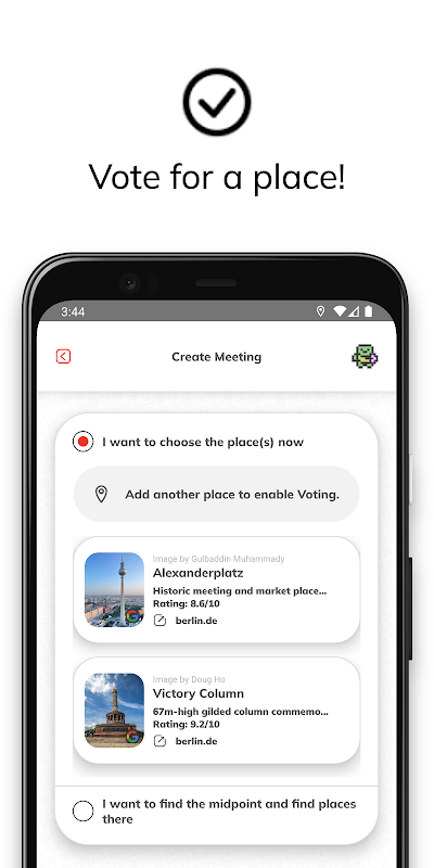 আপনি যদি এখনও সিদ্ধান্ত না নিয়ে থাকেন, নতুন জায়গা খুঁজতে আমাদের নতুন উন্নত বৈশিষ্ট্য ব্যবহার করুন। MeetUs সমস্ত অংশগ্রহণকারীদের অবস্থানের উপর ভিত্তি করে বার/রেস্তোরাঁ/ক্যাফে এবং আরও অনেক কিছুর পরামর্শ দেবে। তারপরে আপনি সমস্ত অংশগ্রহণকারীদের ভৌগলিক কেন্দ্রে অবস্থিত একাধিক বিকল্প থেকে চয়ন করতে সক্ষম হবেন।