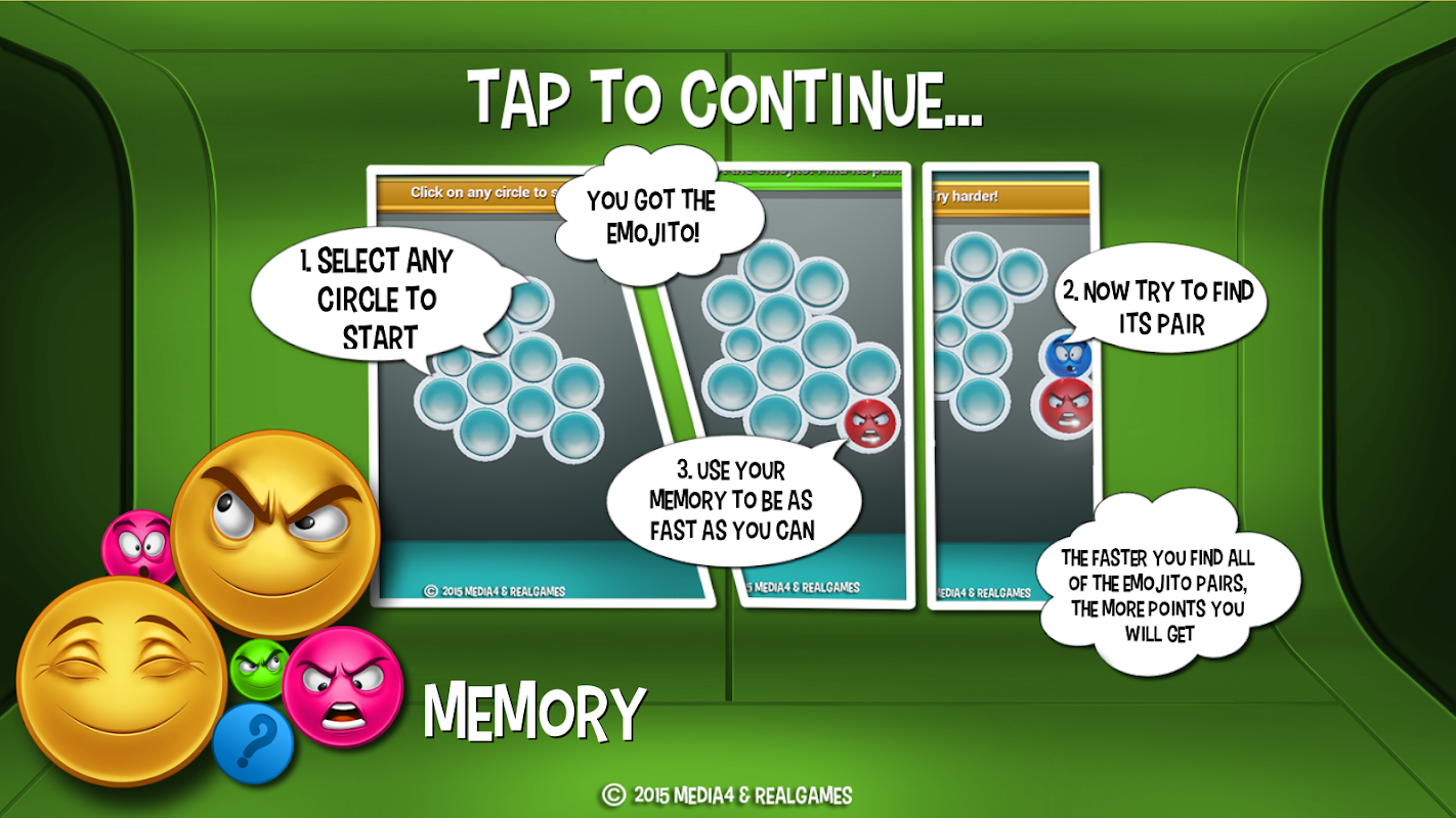 Test how well you distinguish colors and different emotions while enjoing a great and challenging gameplay. All of the emojitos are turned face down. Try to find all matching emojito pairs with less clicks and minimum time as possible to get higher score! Remember to use the Power-Up to find more pairs easily.