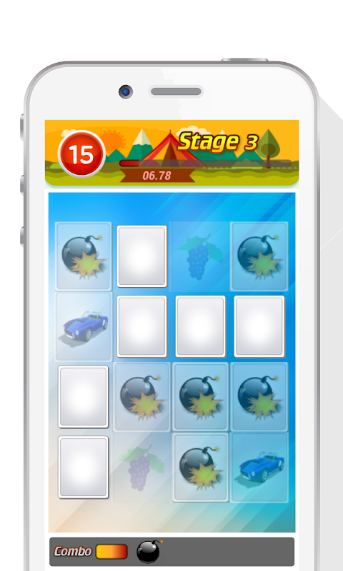 ✓ If you take a bomb, a pair of cards will disappear and the timeout will increase by 2 seconds.